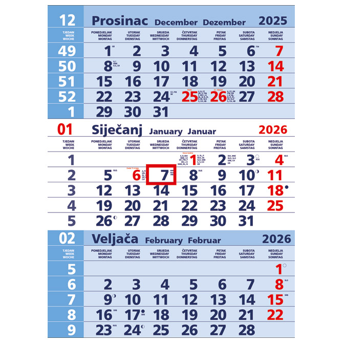 Kalendar zidni trodijelni mali 2026.-3 mjesec/listu, spirala!!