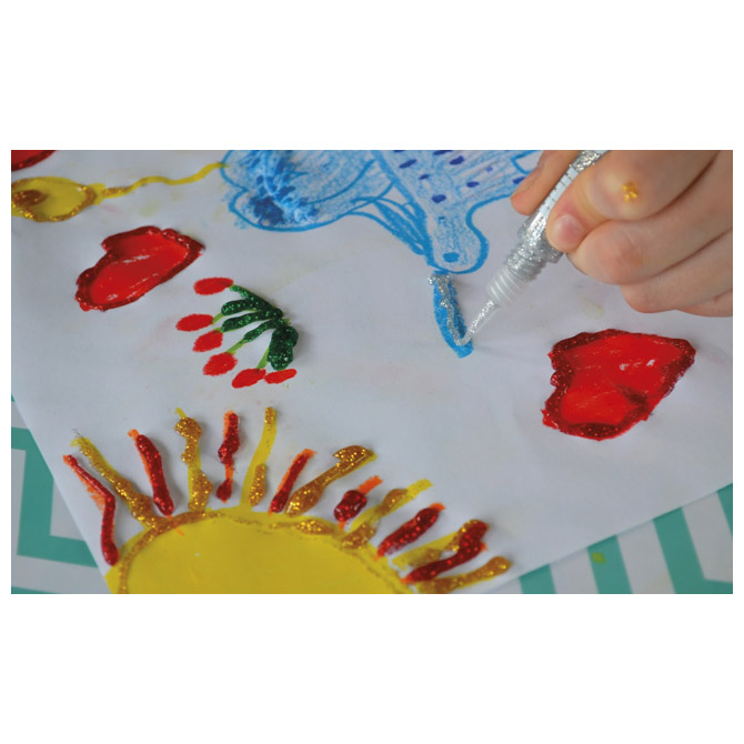 mekana tuba u obliku olovke za lakše dekoriranje; sa šljokicama (sjajni svjetlucavi efekti); za ukrašavanje papira, kartona, drvo i sl.; nije prikladno za: plastiku, neke vrste papira s premazom i metal; ne kaplje i ne rasteže se; ovisno o nanesenoj količini, ljepilo je suho na dodir nakon približno 30 minuta, a potpuno je suho nakon približno 12 sati; kada se osuši, ljepilo se može isprati na 30 °C u perlici ili ručno; dermatološki testirano; 20 g