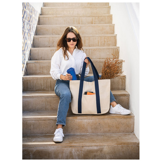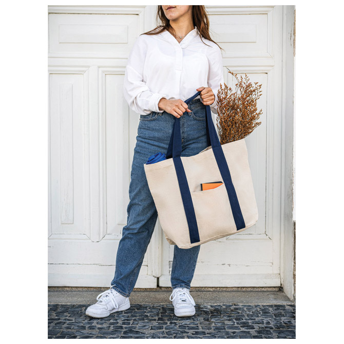 od 100% pamučnog platna (280 g/m2); sa prednjim džepom, unutarnjim džepom na patentni zatvarač i ručkama od 60 cm; ima zatvaranje na magnet; dimenzija: 530x380x170 mm