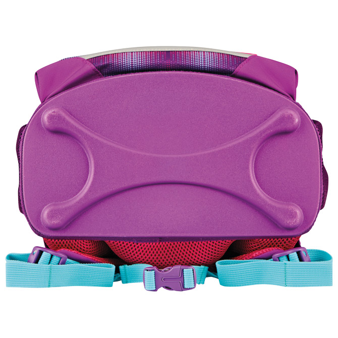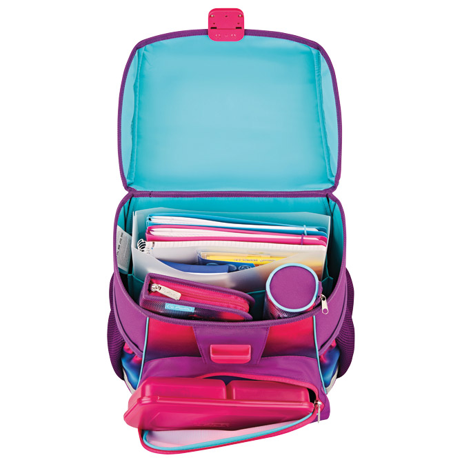 sadrži: torbu školsku (dimenzija: 37x31x22 cm; kapacitet: 15 l; težina: 900 g; anatomska; ergonomski oblikovan leđni dio omogućava protok zraka; podesive naramenice; kopča na klik; 3M reflektirajuće trake; vodootporni materijal; veliki unutarnji pretinac sa posebnim pretincem za knjige; 1 prednji džep; 2 džepa sa strane); vrećicu za tjelesni, pernicu punjenu sa 16 komada pribora i pernicu vrećicu okruglu